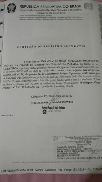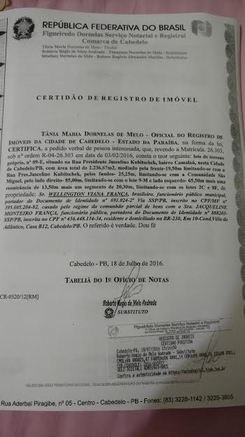 As certidões que comprovam a propriedade dos bens de Leto foram obtidas junto ao cartório Figueiredo Dornelas Serviço Notarial e Registral da Comarca de Cabedelo.