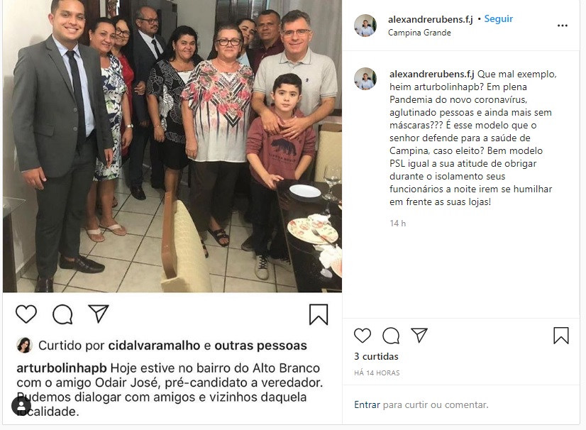 Em meio à polêmica de que funcionários de lojas da cidade de Campina Grande, na Paraíba, teriam sido obrigados pelos patrões a participar de protesto que pedia a reabertura do comércio, realizado em abril deste ano, o empresário que também é pré-candidato a prefeito da Artur Bolinha, do PSL, teve seu nome envolvido em mais uma polêmica, viralizou nas redes sociais, um suposto post de Bolinha, onde faz uma visita a casa de um dos seus pré-candidatos a vereador chamado Odair José, onde além de promover aglomeração de pessoas todas estão sem mascaras de proteção, ferramenta essa ‘máscaras’ essenciais para evitar a transmissão do novo coronavírus.