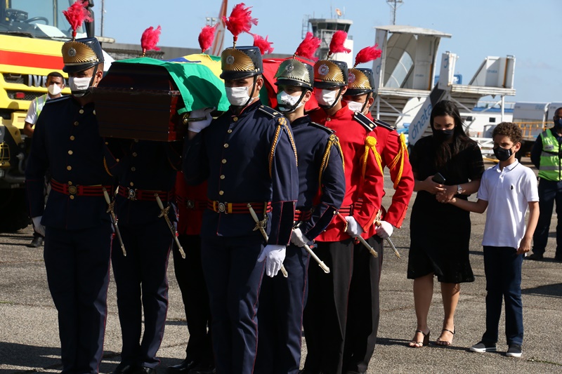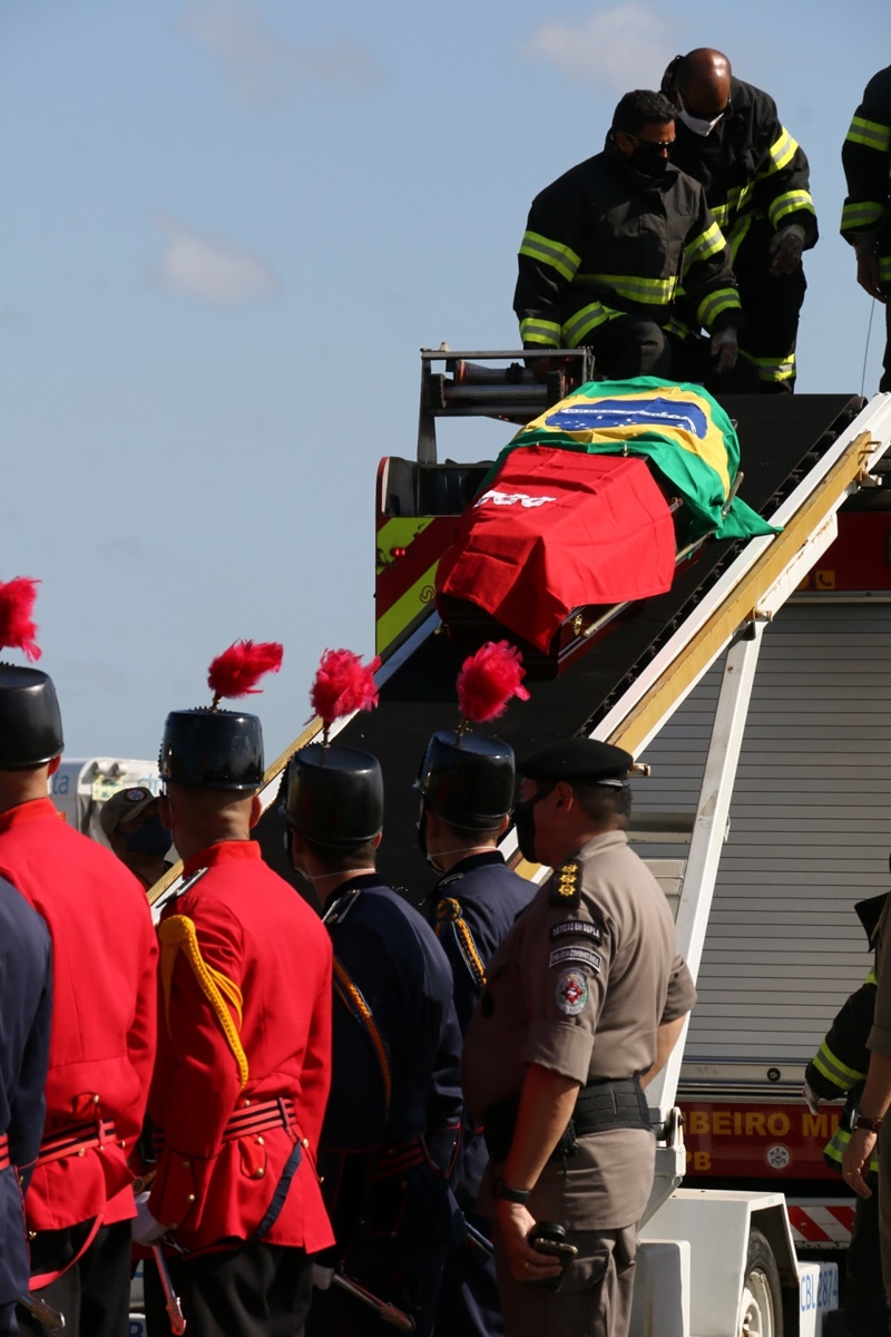 O corpo do senador José Maranhão chegou à Paraíba no início da tarde de hoje, vindo de São Paulo em um avião da Força Aérea Brasileira (FAB) e foi conduzido ao hangar do Governo do Estado por cadetes da Polícia Militar. No local, foram prestadas as honrarias de chefe de estado ao ex-governador e realizada uma cerimônia ecumênica.