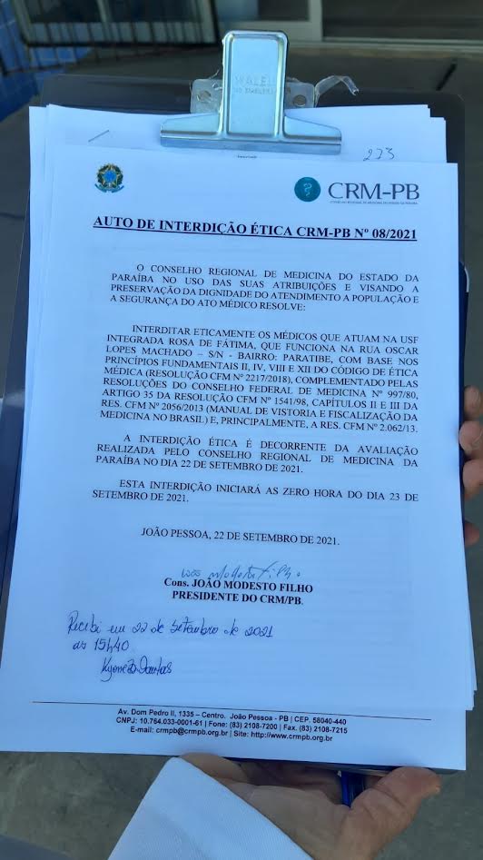 O Conselho Regional de Medicina do Estado da Paraíba (CRM-PB) interditou eticamente os médicos que trabalham na Unidade Básica de Saúde (UBS) Integrada Rosa de Fátima, no bairro de Paratibe, em João Pessoa, após fiscalização realizada na tarde desta quarta-feira (22). A unidade conta com quatro equipes de saúde da família, estando uma delas sem médico e outra com atendimento feito por profissional sem registro no CRM-PB. Além disso, faltam equipamentos básicos para consultas e estrutura física apresenta problemas graves, com ambiente insalubre para profissionais e pacientes.