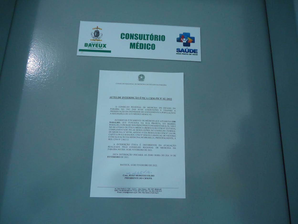 O Conselho Regional de Medicina do Estado da Paraíba (CRM-PB) fiscalizou a Unidade Básica de Saúde Baralho, em Bayeux, na última sexta-feira (18) e interditou eticamente os médicos que trabalham no local. A equipe do CRM-PB já havia vistoriado a unidade no dia 8 de fevereiro, constatou os problemas de infraestrutura, insalubridade, ausência de equipamentos básicos, além de falta de segurança para profissionais e pacientes. No dia 18, as providências para resolução das inconformidades ainda não haviam sido tomadas e o Conselho interditou eticamente a UBS, a partir da zero hora do dia 19.