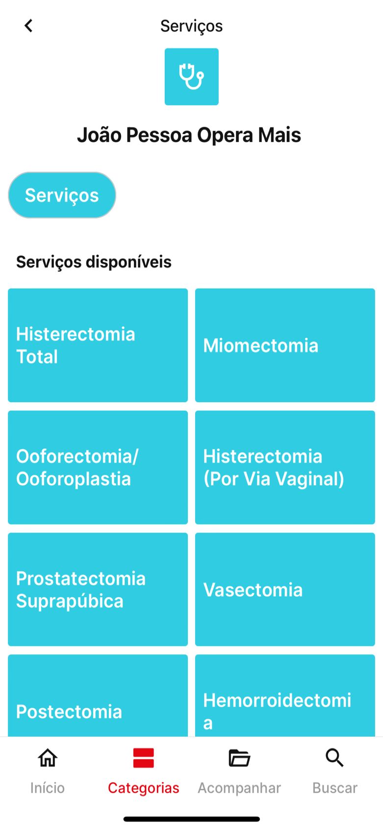 Dentro da categoria saúde, é possível solicitar exames como endoscopia digestiva alta, colonoscopia, mamografia, ultrassonografia e ecocardiograma. Também é possível solicitar cirurgias pelo programa João Pessoa Opera Mais, além de acompanhar o andamento de uma cirurgia já solicitada.