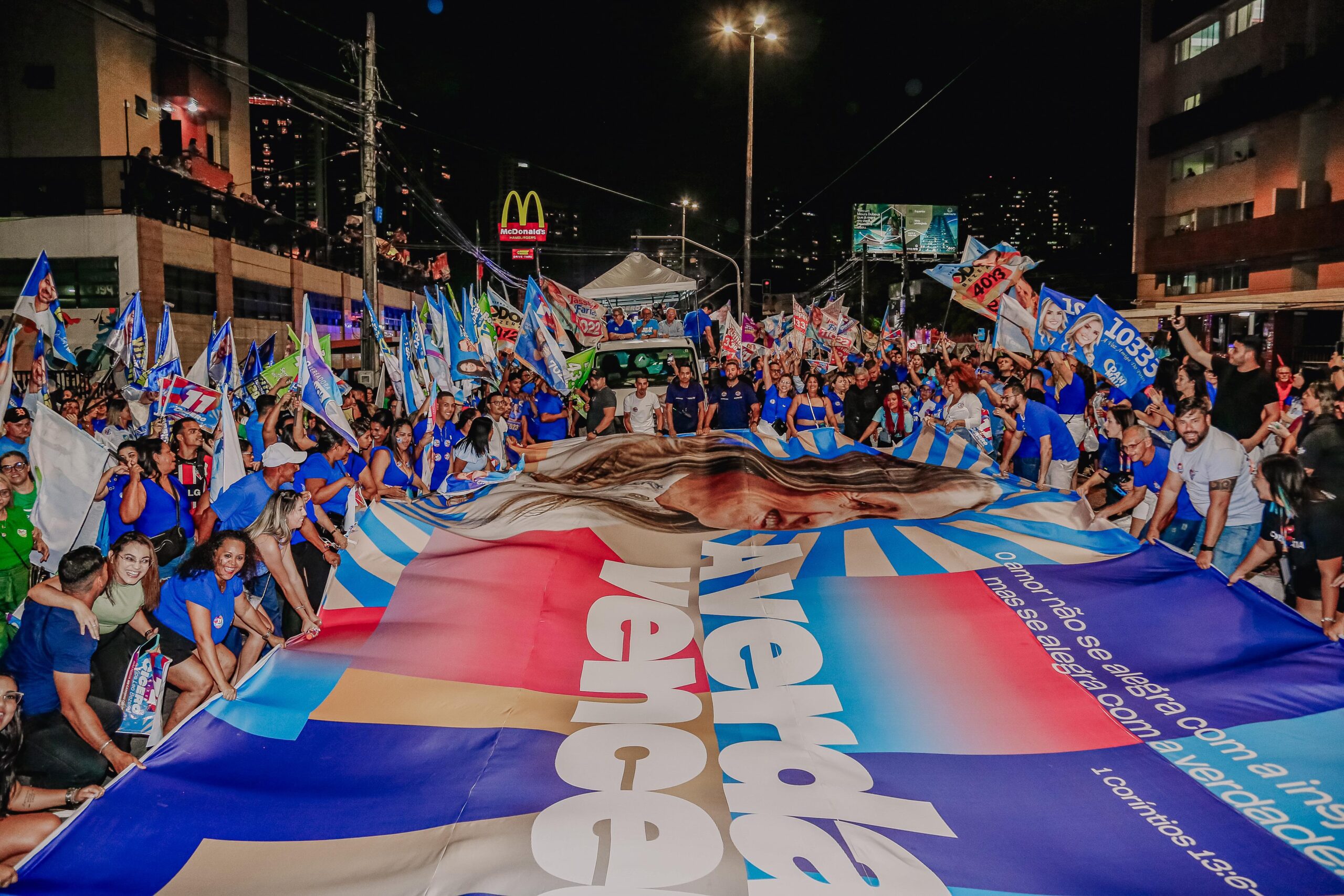 “Numa quarta-feira de uma semana de trabalho, tenho certeza absoluta que essa imagem, esse carinho, esse amor que vocês demonstraram, ficarão na história e guardados no canto mais profundo do meu coração e da minha alma. Eu só posso retribuir com muito trabalho, com muita dedicação, com muita coragem”, afirmou Cícero Lucena, na companhia da primeira-dama Lauremília Lucena, que foi homenageada pela multidão com uma bandeira gigante.