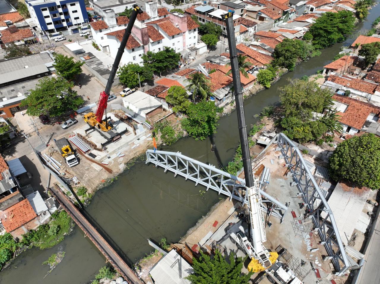 “Essa ponte é completa, com duas faixas para veículos, ciclovia e ciclofaixa. A operação desta quinta-feira consiste em elevar duas treliças grandes em aço até a base de concreto que já está pronta. A nossa expectativa é que o serviço dure dois dias e, já a partir da próxima semana, esperamos iniciar a concretagem da laje para, nos próximos 40 dias, entregar a ponte à população”, explicou Luciano.