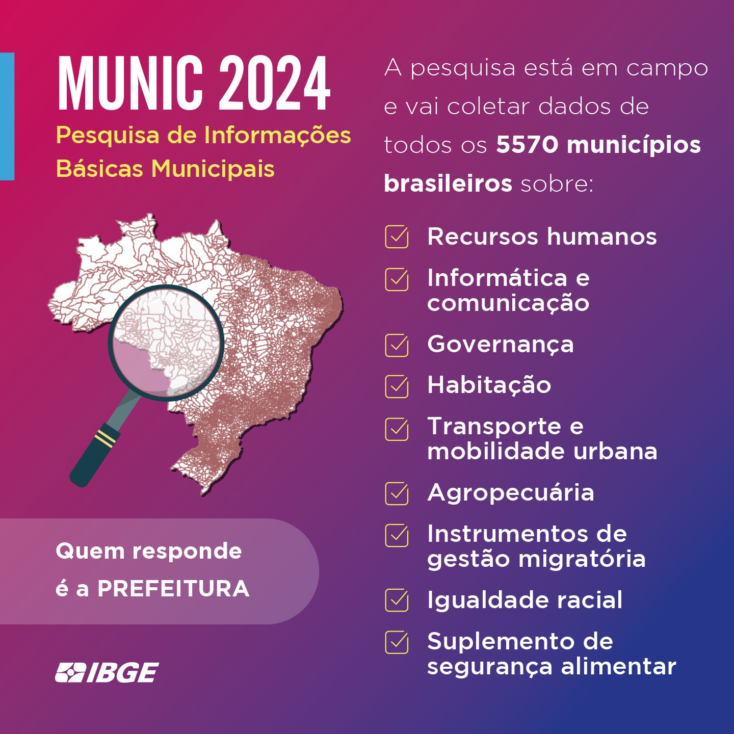 Um dos destaques da pesquisa é a inclusão do bloco específico sobre Igualdade Racial. “É uma novidade porque a MUNIC nunca investigou esse tema. Comunicação da Pesquisa de Informações Básicas Municipais, evento realizado nas 223 prefeituras, já em andamento de coleta, sugestão de apoio e comunicação aos novos prefeitos.