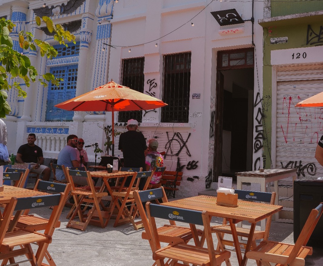 O ambiente ganhou uma intervenção de pixação, realizada tanto pela equipe do Loca quanto pelos próprios moradores do Centro Histórico, que aproveitaram as marcas já existentes nas paredes. Essa iniciativa cria uma conexão autêntica com a cultura urbana e dá ainda mais identidade ao local, transformando-o em um ponto que reflete o espírito boêmio e criativo da cidade.