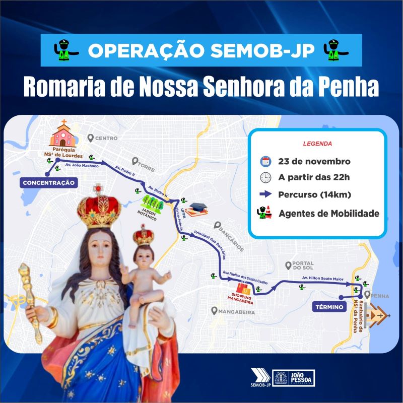 A Superintendência Executiva de Mobilidade Urbana de João Pessoa (Semob-JP) definiu a operação de trânsito e transporte para garantir a segurança viária e a operacionalidade do transporte público durante a 261ª Romaria de Nossa Senhora da Penha, que ocorrerá do próximo sábado (23), até as primeiras horas do domingo (24). Neste ano, o tradicional evento religioso, como em anos anteriores, espera a participação de mais de 500 mil pessoas neste ato de fé e adoração.