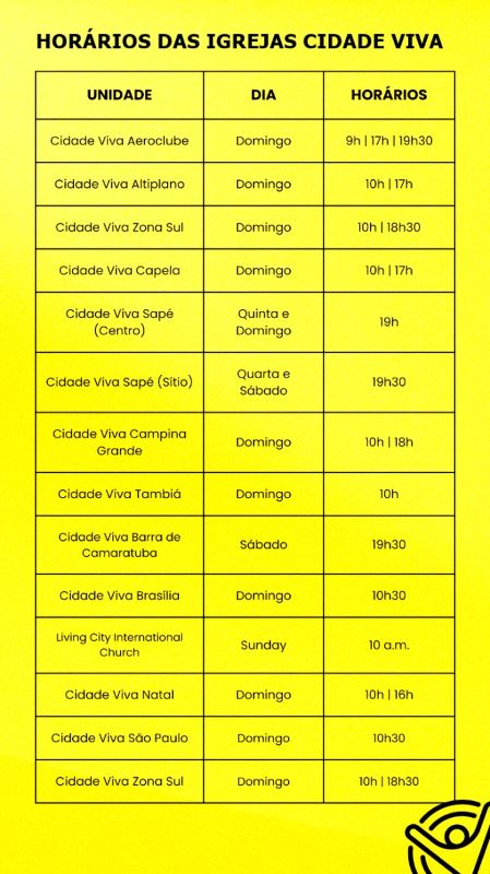 SOBRE A IGREJA CIDADE VIVA – A Cidade Viva, que está em processo de expansão de suas unidades, atualmente tem 13 igrejas abertas, que estão localizadas em três Estados (Paraíba, Rio Grande do Norte e São Paulo) e em Brasília, no Distrito Federal. Com cerca de 50 áreas de atuação, a igreja está baseada em três propósitos: Conectar, Crescer e Compartilhar, tendo como missão “conduzir pessoas a um relacionamento autêntico com Jesus Cristo, para que vivam com dignidade e sejam frutíferas no mundo”, enquanto a sua visão é “de ser uma comunidade capaz de influenciar João Pessoa, a Paraíba, o Brasil e o mundo a viverem o cristianismo bíblico de maneira relevante em seus contextos socioculturais, para a glória de Deus e para a alegria da humanidade”.