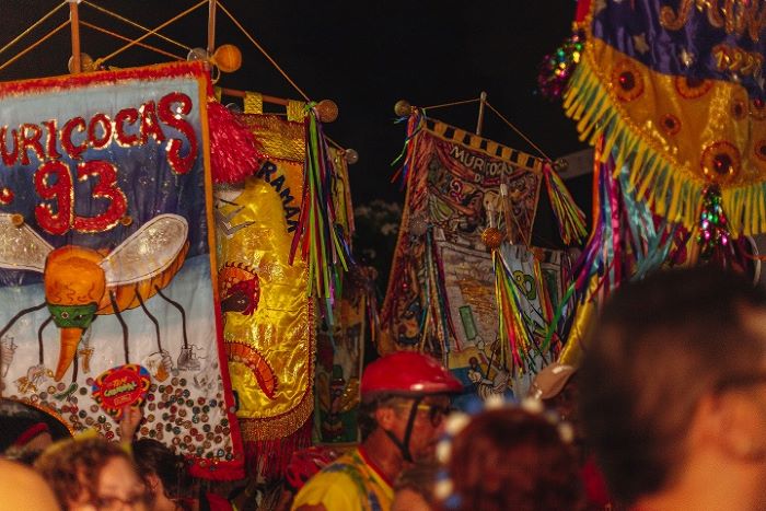 Ritual e Tradição – Um dos momentos mais esperados é o tradicional ritual diante da casa da professora Vitória Lima, fundadora do bloco, na Rua José Liberato. Pontualmente às 22h, ocorre uma queima de fogos, seguida da apresentação oficial do estandarte 2025, criado pelo artista visual Thayroni Arruda, marcando oficialmente a saída do cortejo. Neste instante, a ala do cordão, com cerca de 40 estandartes e foliões fantasiados, segue embalada pelas orquestras de frevo rumo à Via Folia para encontrar o primeiro trio elétrico, onde Mestre Fuba, puxador oficial e autor do inesquecível hino das Muriçocas, conduz o emocionante canto: “Alô, alô João Pessoa, é o Muriçocas do Miramar!”. Ao som contagiante de Fuba e sua banda, o desfile ganha vida, vibrando com o tradicional trê lê lê e o zum zum zum de centenas de foliões.