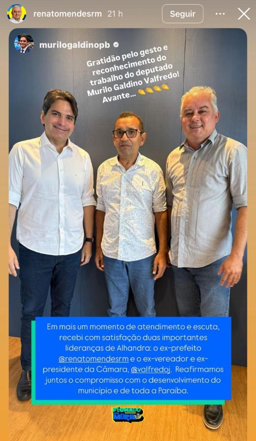 O cenário político da cidade de Alhandra segue cheio de nuances, reviravoltas e figuras que transitam entre os polos como se não houvesse distinção entre governo e oposição. A mais recente movimentação que vem dando o que falar é o reaparecimento do ex-vereador, Professor Valfredo, ao lado do ex-prefeito Renato Mendes em uma postagem do deputado federal Murilo Galdino. O que chamou a atenção de muitos não foi apenas a imagem em si, mas o que ela representa no xadrez político local.