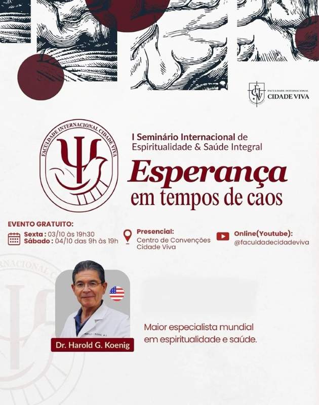 Como a fé pode ajudar no enfrentamento e na prevenção de doenças, na redução da depressão e no bem-estar geral? Uma das maiores autoridades mundiais no campo da espiritualidade e a sua influência sobre a saúde, o Dr. Harold G. Koenig, vai ministrar na Faculdade Internacional Cidade Viva (FICV), em João Pessoa, nos dias 3 e 4 de outubro, no “I Seminário Internacional de Espiritualidade & Saúde Integral”, que acontece no Centro de Convenções Cidade Viva, no bairro Aeroclube.