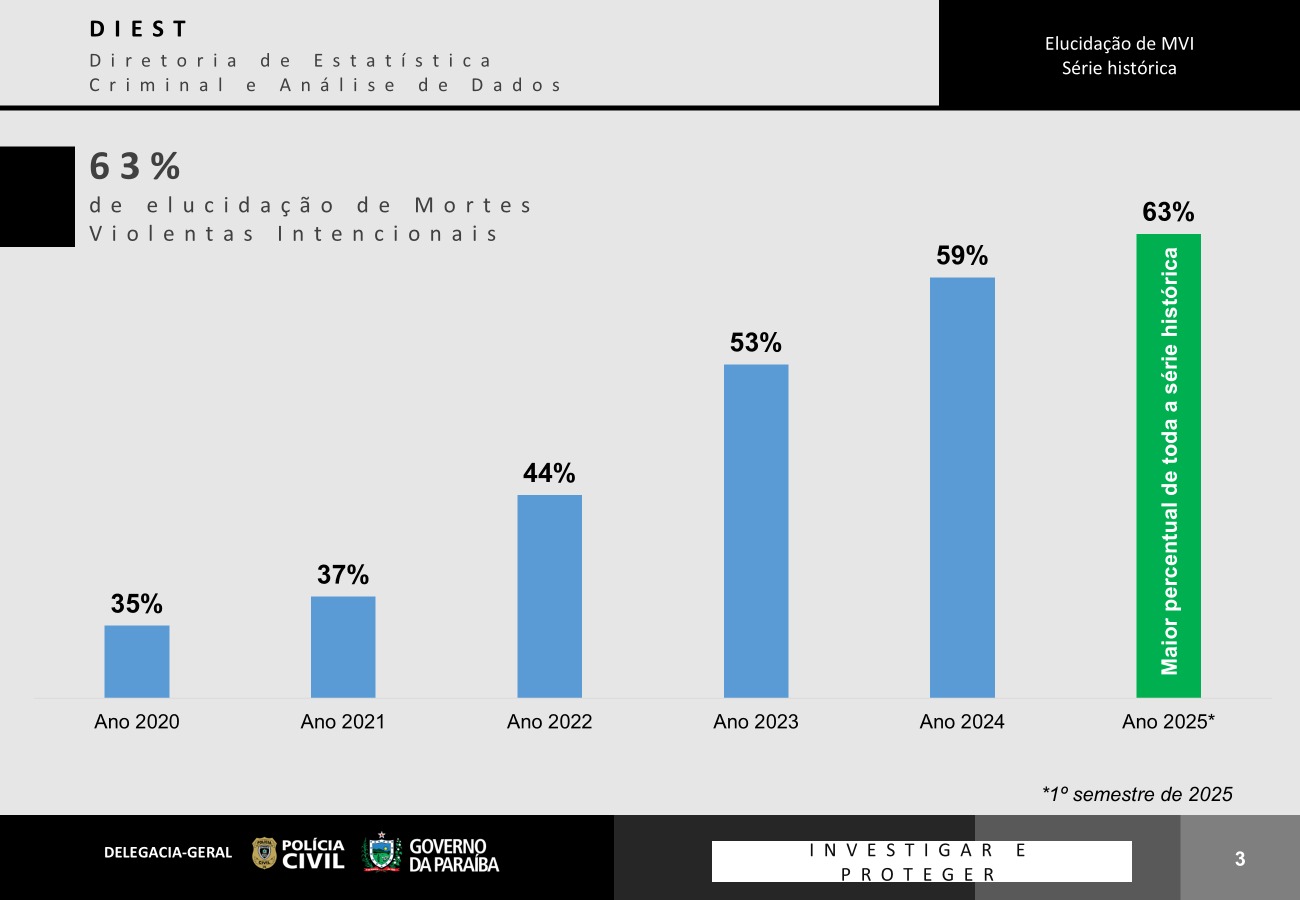 O percentual de elucidação de Mortes Violentas Intencionais (MVIs) na Paraíba no primeiro semestre deste ano alcançou, pela primeira vez, a marca de 63% dos casos. Os números são da Diretoria de Estatística Criminal e Análise de Dados (DIEST) da Delegacia-Geral da Polícia Civil. É o percentual mais elevado desde que esse tipo de estatística foi implantado no estado, no ano de 2013.