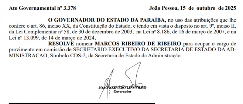O governador João Azevêdo (PSB) nomeou o presidente estadual do PDT, Marcos Ribeiro, como o novo secretário executivo de Administração do Estado. A medida foi publicada na edição desta quinta-feira (16) do Diário Oficial da Paraíba.