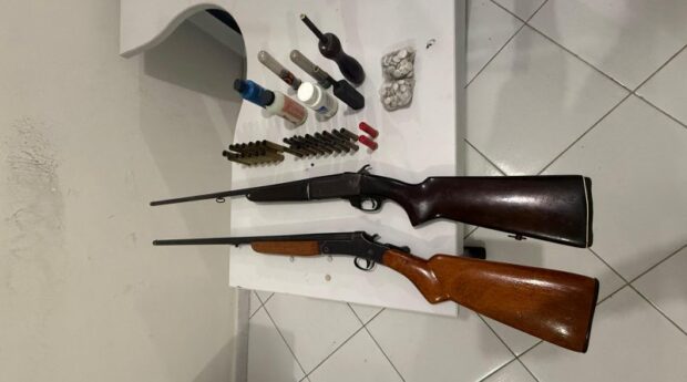 Ele tentou se desfazer de alguns objetos assim que percebeu a presença da PM. O suspeito estava com material para recarga de munições. Nas buscas, as armas foram localizadas. A ocorrência foi levada para a Delegacia de Polícia.