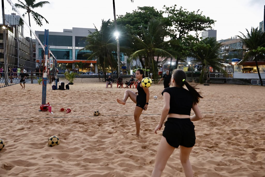 As praticantes Vitória Almeida e Eloisa Nascimento reforçam que o futevôlei melhora a saúde mental e o condicionamento físico, sendo uma forma divertida e saudável de aliviar o estresse.