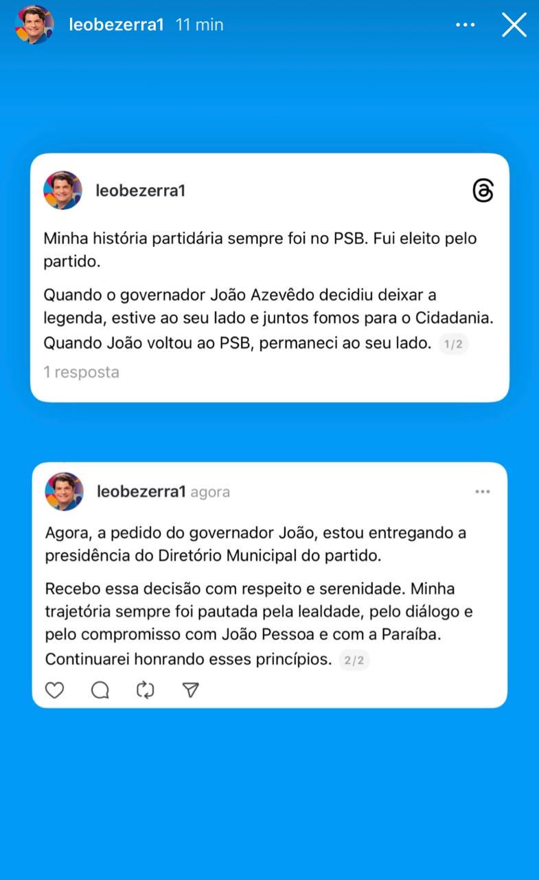 Nas redes sociais, Léo ressaltou que sua história sempre foi no PSB e que continua filiado ao partido. Ele lembrou que acompanhou João nas mudanças de legenda e permaneceu ao seu lado quando o governador voltou ao PSB.