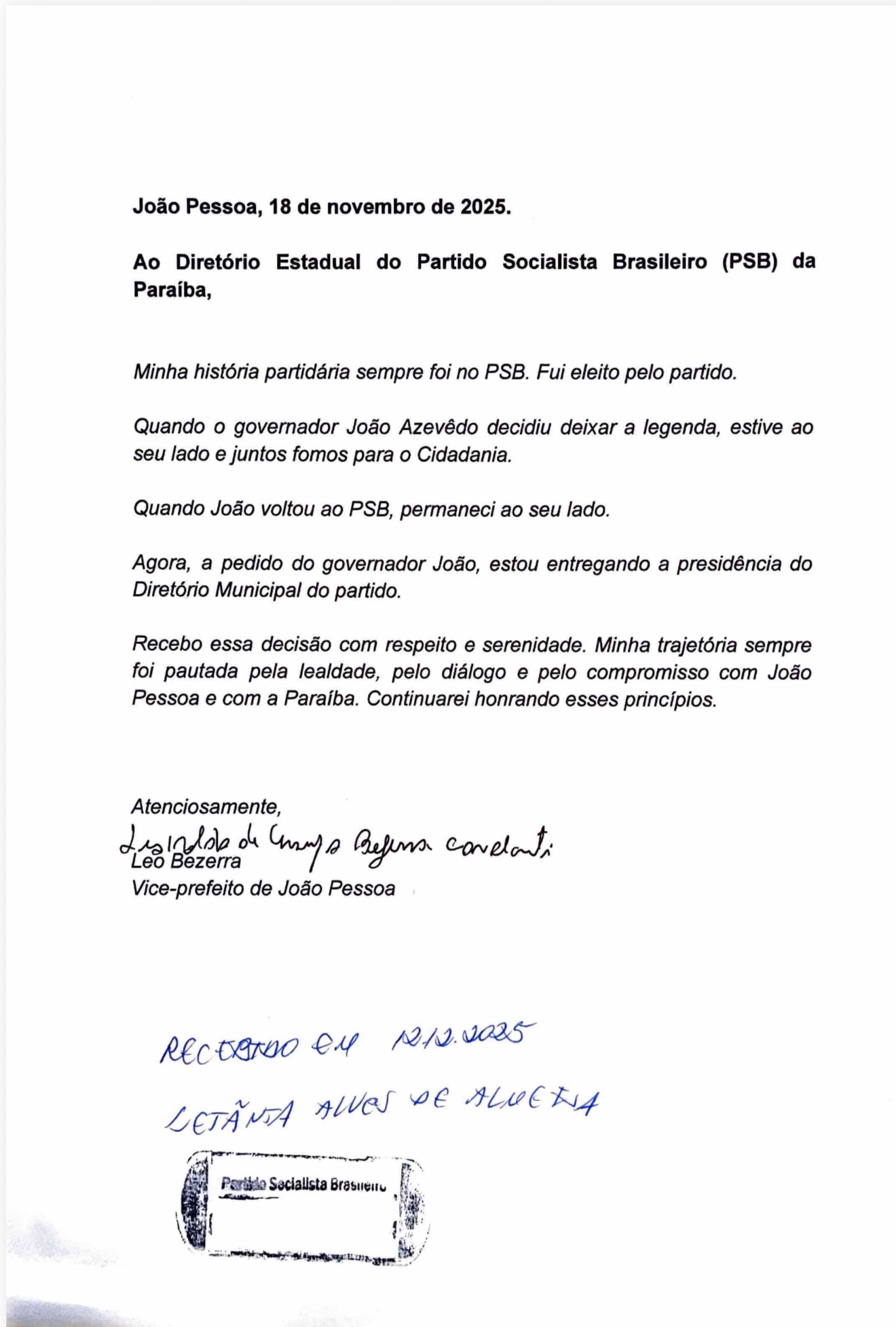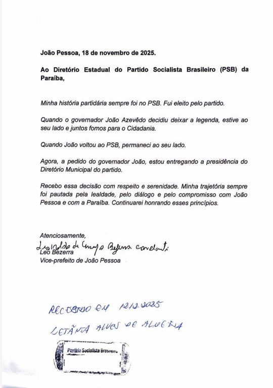 Na carta, o vice-prefeito destaca que sua trajetória sempre esteve ligada ao PSB, legenda pela qual foi eleito. Ele relembra que acompanhou João Azevêdo quando o governador deixou o partido e migrou para o Cidadania, e que novamente o acompanhou no retorno ao PSB. “Agora, a pedido do governador João, estou entregando a presidência do Diretório Municipal do partido”, escreveu.