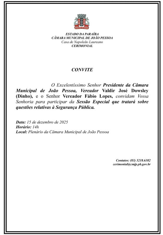 “A segurança pública é hoje uma das maiores preocupações dos pessoenses. Essa sessão especial é fundamental para reunir autoridades, ouvir quem está na linha de frente e cobrar ações efetivas. Não podemos normalizar a violência nem permitir que facções e o crime organizado avancem sobre a nossa cidade”, destacou o parlamentar.