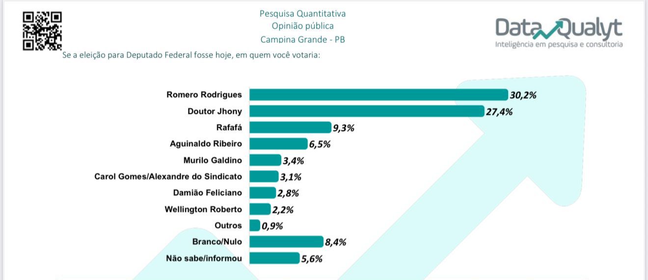 A pesquisa do Instituto DataQualyt, em parceria com o Blog do Márcio Rangel, divulgada neste sábado (20), revela um cenário de forte competitividade na disputa por uma vaga na Câmara Federal em Campina Grande. O levantamento mostra Doutor Jhony em trajetória consistente de crescimento e em empate técnico com o deputado Romero Rodrigues, que lidera numericamente a intenção de votos no município.