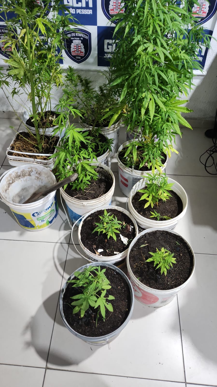 A Polícia Militar apreendeu 11 pés de maconha e aproximadamente 3 kg da droga em tabletes, na noite desta terça-feira (6), após denúncias, em uma área de mata que fica no bairro das Indústrias, em João Pessoa. Os suspeitos conseguiram fugir assim que perceberam a chegada das equipes da Força Tática do 5º Batalhão. O material foi levado para a Cidade da Polícia, no Geisel.