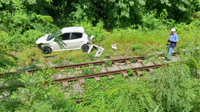 Um acidente foi registrado na manhã desta sexta-feira (16) no bairro Ilha do Bispo, em João Pessoa. Um motorista perdeu o controle do carro, que caiu sobre a linha do trem, provocando susto e curiosidade entre as pessoas que passavam pelo local.