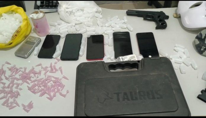No local, foram apreendidos recipientes comumente utilizados para o acondicionamento de substâncias entorpecentes, pinos para armazenamento de cocaína, envelopes para fracionamento e comercialização de drogas, uma balança de precisão, porções de substâncias análogas a crack e maconha, uma caixa vazia de arma de fogo, uma munição calibre .38, um simulacro de arma de fogo, uma máscara possivelmente utilizada em ações criminosas, além de cinco aparelhos celulares.