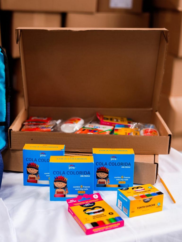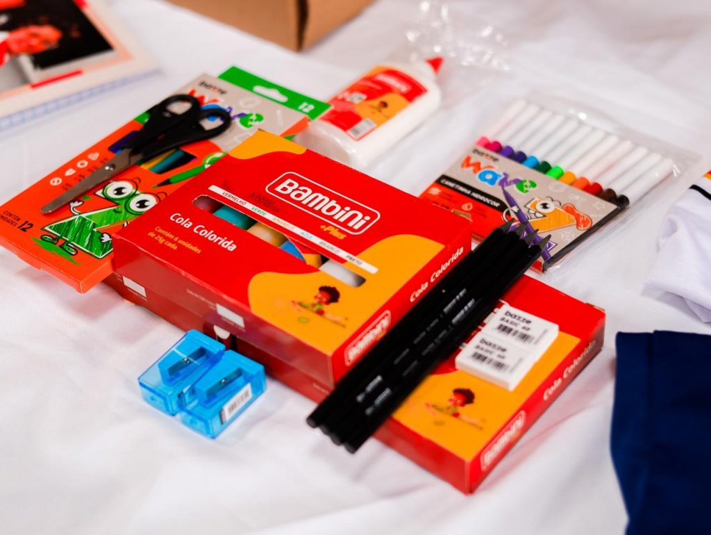 Kit do aluno – As crianças da Educação Infantil vão receber nas próprias unidades de ensino dois cadernos, agenda, caneta hidrográfica, tinta guache, cola colorida, caneta, borracha, cola branca e mochila de carrinho.
