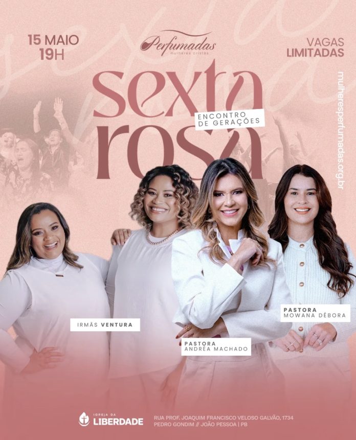 A décima edição do Sexta Rosa já tem data marcada e promete ser mais uma noite de impacto espiritual e fortalecimento feminino. O evento acontece no dia 15 de maio de 2026, às 19h, na Igreja da Liberdade, reunindo mulheres de diferentes gerações em um ambiente de adoração, comunhão e renovação.