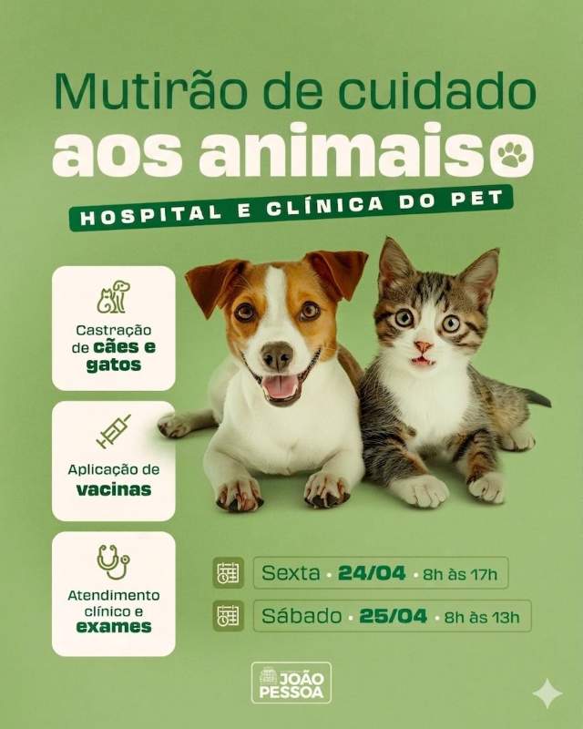 A Prefeitura de João Pessoa (PMJP), por meio das Secretarias de Cuidado e Proteção Animal (Secupa) e de Meio Ambiente (Semam), realiza, em dois dias, o Mutirão de Cuidado aos Animais, oferecendo uma série de serviços gratuitos para cães e gatos. A ação será realizada nesta sexta-feira (24), das 8h às 17h, e no sábado (25), das 8h às 13h, com atendimentos voltados à saúde e bem-estar dos pets. Os atendimentos serão feitos no Hospital do Pet e na Clínica do Pet.