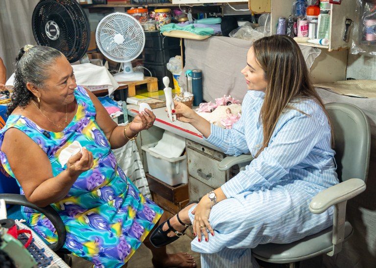 A visita da primeira-dama Camila Mariz às artesãs homenageadas foi acompanhada, ainda, pela coordenadora de Capacitação do PAP, Yara Alencar, assim como por outros auxiliares do programa e da Setde.