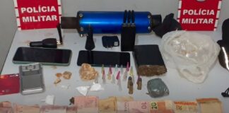 Polícia prende três e apreende moto roubada, drogas e bloqueador de...