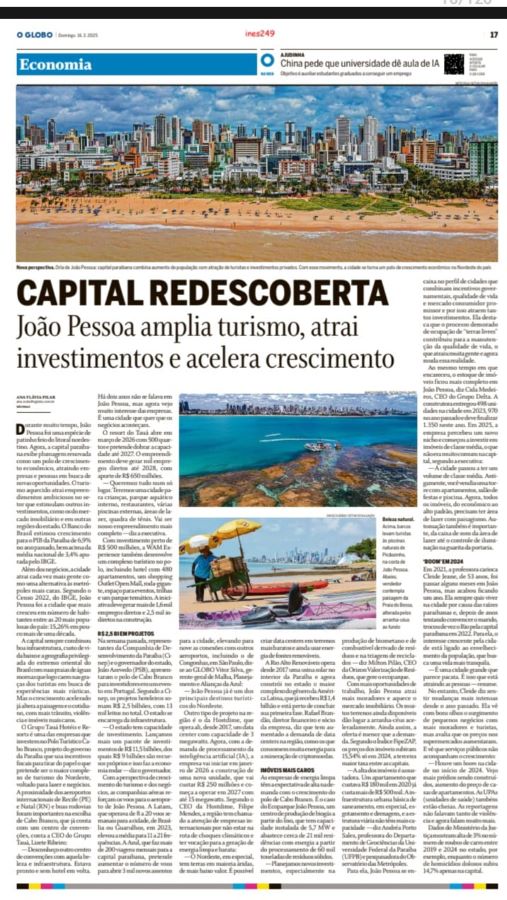 O texto de O Globo destaca João Pessoa como uma das cidades que teve maior crescimento entre as 20 mais populosas do país e, com isso, registrou um boom no turismo e nos investimentos.